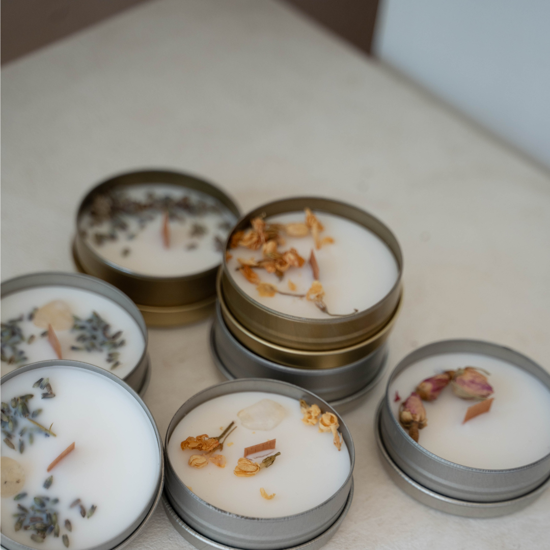 Sojawachs Kerze mit Trockenblüten (Rose, Lavendel oder Jasminblüte) - Gold ◎